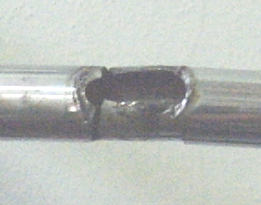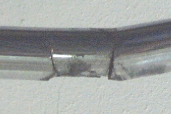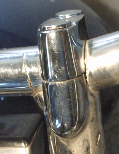 ![]() Prasklina řidítek v držáku před demontáží. Vnitřní prasklina je viditelná. Venkovní vede přesně v okraji držáku, není téměř znatelná a je podstatně větší. |