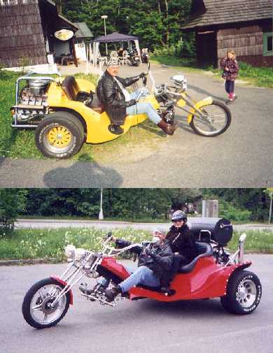 Franta se svou tříkolkou s osmiválcovým motorem z Tatry 603 s obsahem 2500 cm3 (žlutá).