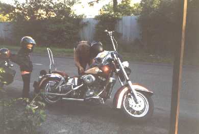 Honza po několika peripetiích je opět zpět. Svého stařičkého H-D Shovelhead ale prodal a jezdí na H-D Buell, nemám ale novou fotku.(Vlevo od Honzy má dcera - cesta na přátelskou návštěvu Bikers Baru - Joe Bar Teamu, podzim 1998).