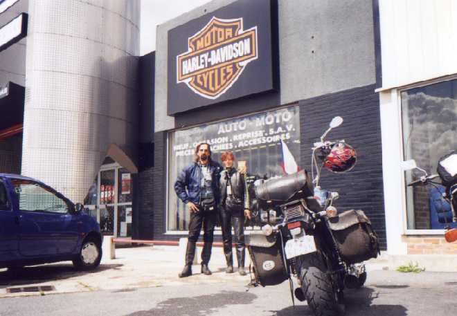 S VLASTOU PŘED JEDNOU Z PRODEJEN MOTORKÁŘSKÉHO KOMPLEXU V REMEŠI. MŮJ INTRUDER VEDLE NÁS JENOM PŘEDE A MOJE DUŠIČKA TAKY. TOLIK MAŠIN POHROMADĚ NEBYLO SNAD ANI NA VÝSTAVĚ V PRAZE.